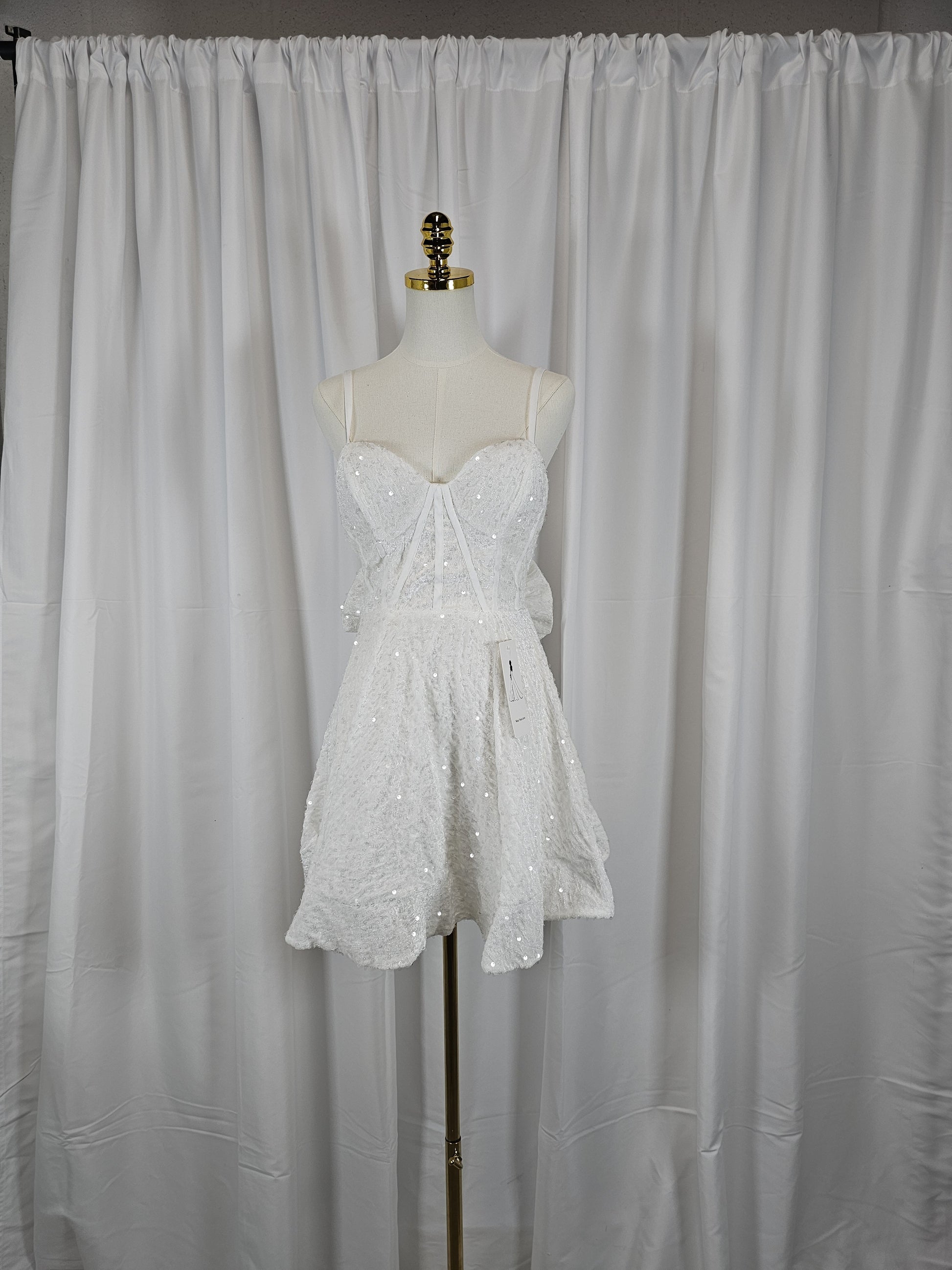 Get ready to turn heads in the Sparkle & Shine dress! This flirty little number is perfect for that spontaneous brunch or an evening filled with twinkling lights. With adornments that catch the light just right, you’ll feel like the life of the party! It's flouncy and fabulous, offering the ideal mix of comfort and charm—it’s like wearing a cupcake, but, you know, in a cool, non-crumbly way. Plus, who doesn’t love a dress that can easily transition from 'I just woke up' casual to 'I can’t believe I’m this fabulous' glam? So slip it on, your dance cards are about to get full, and remember: the only thing better than a little white dress is one that sparkles. P.S. Just don’t wear it while eating spaghetti!