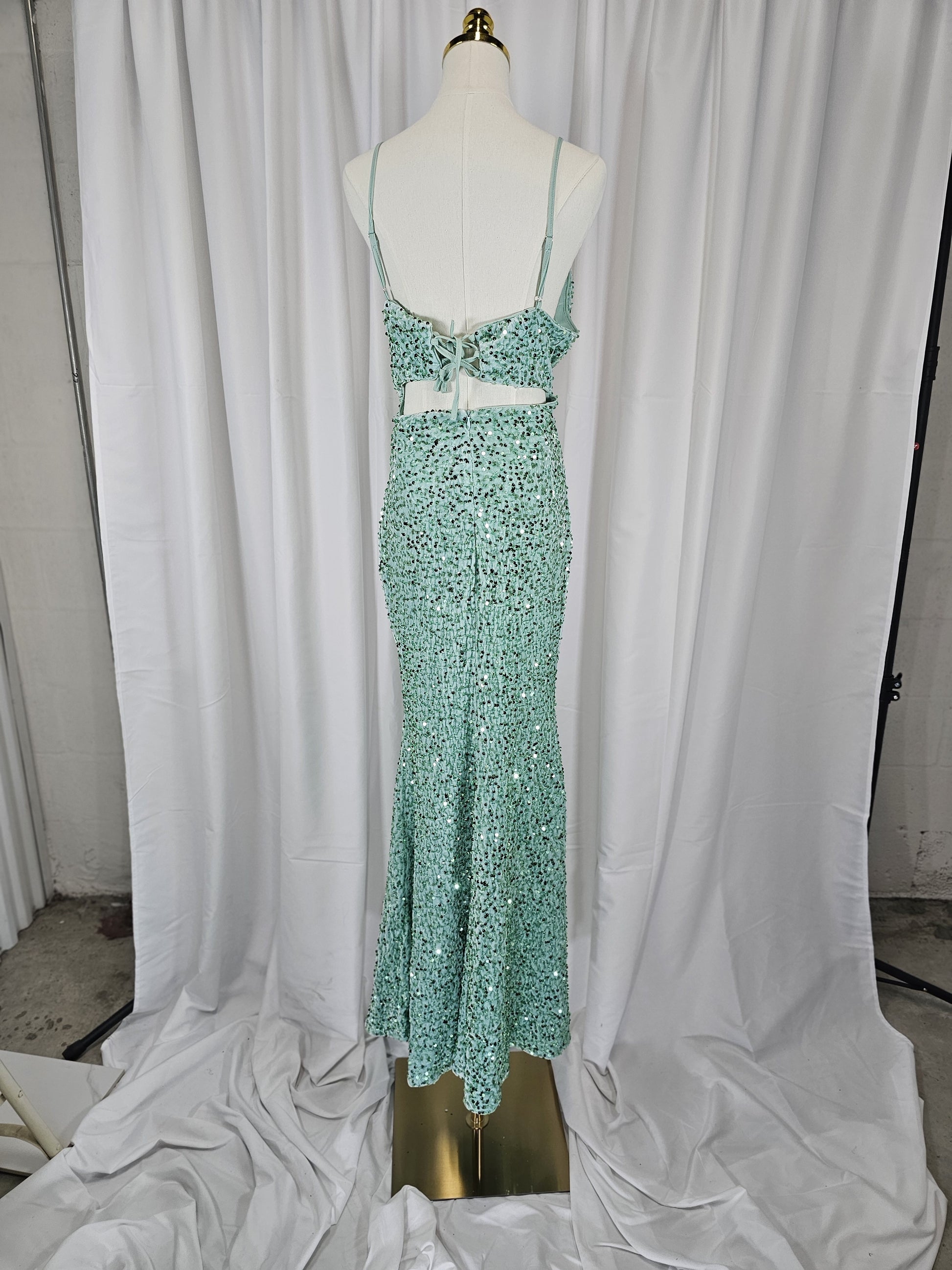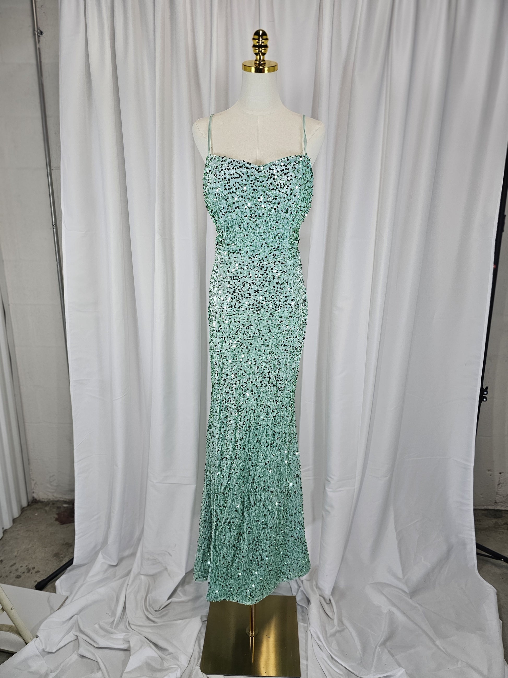 Dive into elegance with our Aqua Shimmer Mermaid Gown, where every twist and turn will catch the light (and maybe even a few hearts)! Whether you're scooting across the dance floor or posing for that perfect 'just-ruined-my-best-friend's-wedding' Insta shot, this dress has got your back (literally, just look at that bow!). It embraces your curves while giving off serious sea goddess vibes. Made with sparkly sequins that might just make you the first person to lightly blind your date—talk about making a statement! Perfect for proms, galas, or any event where you need to turn heads and steal the spotlight. Just remember—this isn't a dress for wallflowers, so get ready to dance like everyone’s watching! 🌊✨