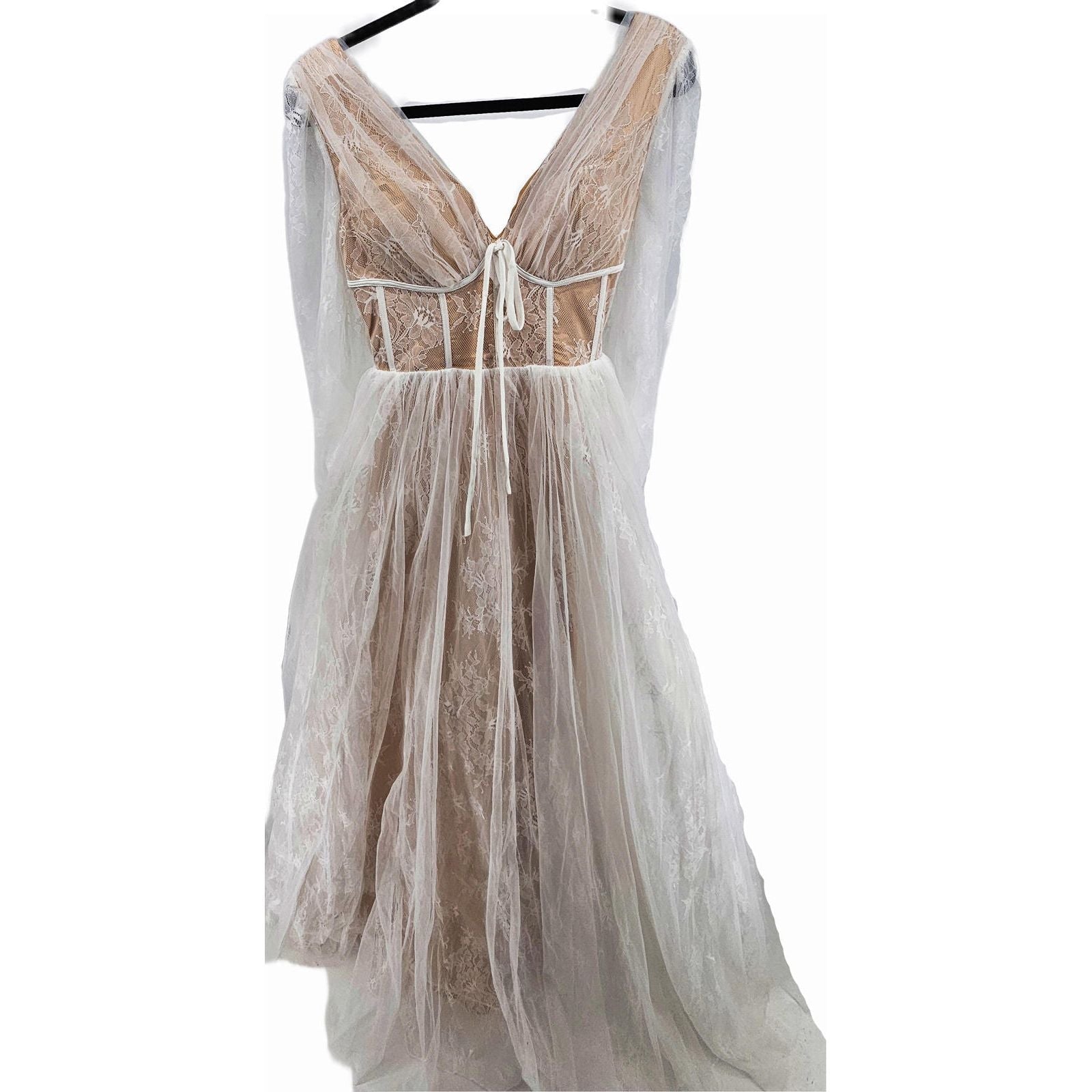 Step into your own fairy tale with this enchanting sheer lace maxi dress! Featuring delicate lace sleeves and a dreamy tulle overlay, this dress is perfect for twirling under the stars or making an unforgettable entrance.
