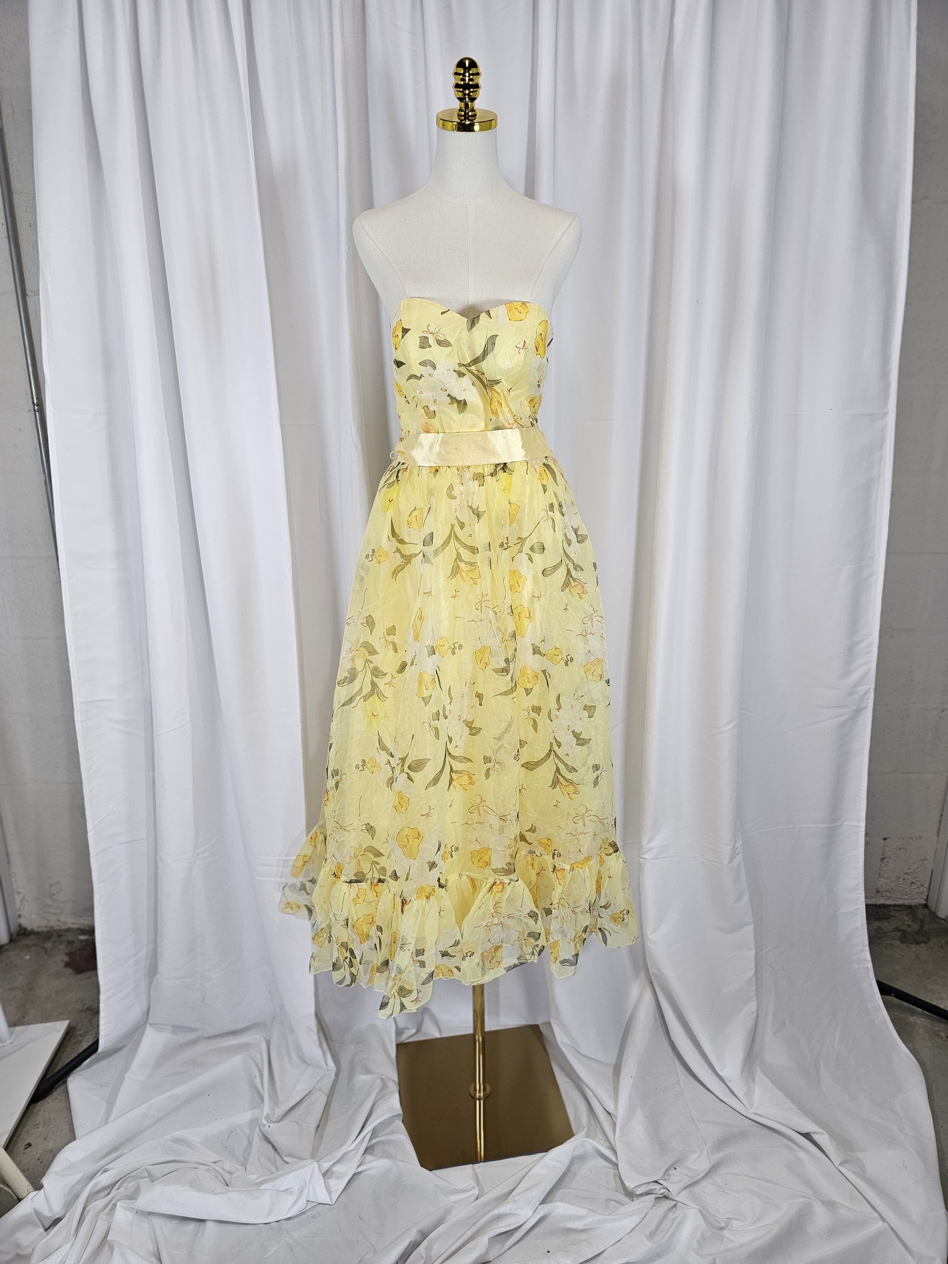 Step into a field of floral dreams with our Sunshine Serenade Midi Dress! This enchanting yellow number is not just a dress; it's a statement piece that says, 'I absolutely deserve a picnic with freshly-squeezed lemonade.' Featuring a stunning strapless design and a delightful ruffled hem that flutters like your excitement on a Friday night, you'll feel like a walking bouquet. Perfect for brunching with friends or that outdoor wedding you tried to steal the spotlight from. Pair it with your favorite sandals and a sunhat, and watch heads turn faster than a sunflower in full bloom. Warning: wearing this dress may cause an increase in daydreams and spontaneous dance breaks.