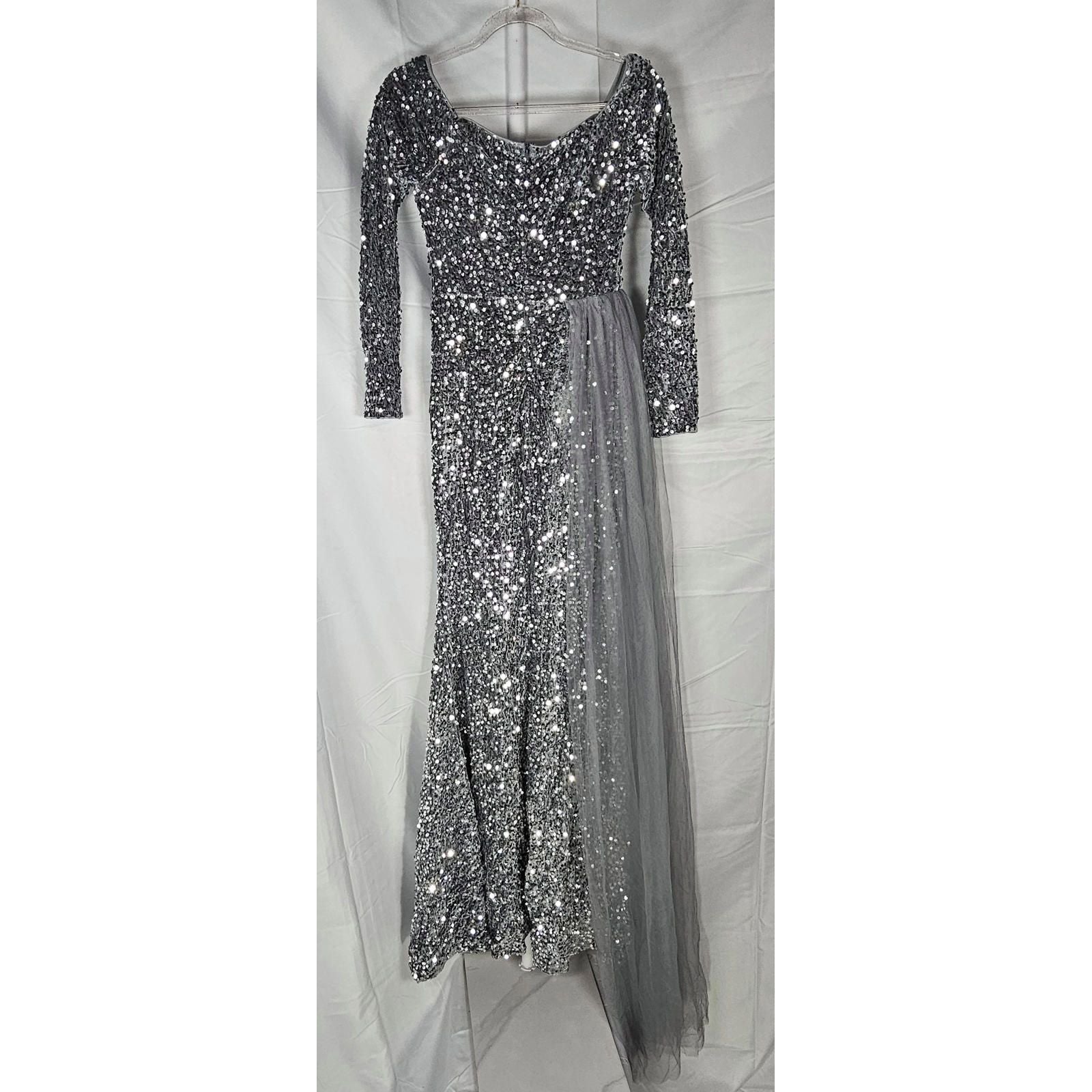 This floor-length stunner is perfect for anyone who believes more is more when it comes to sparkle. The classic silver hue is timeless and versatile, working beautifully for both daytime and evening events, while the sequined surface creates maximum impact with minimal effort.